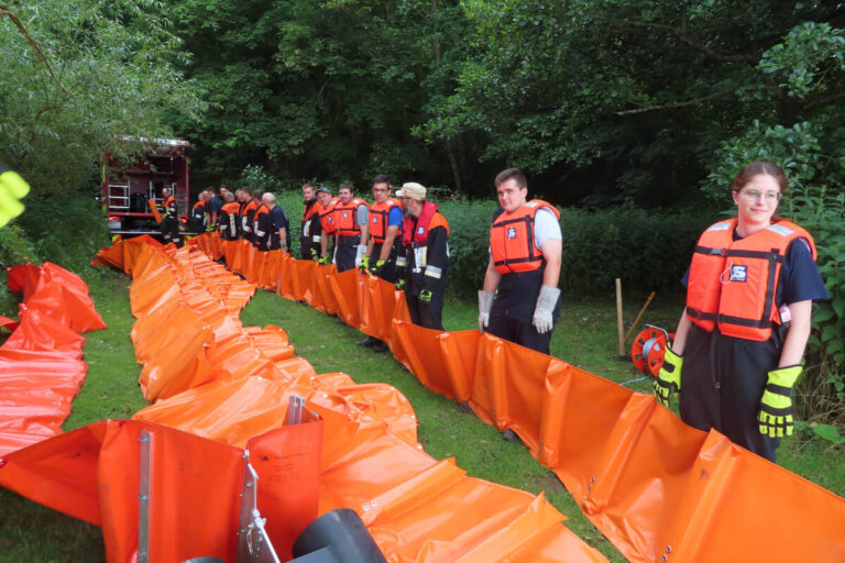 Gemeinsame Übung: Feuerwehren trainieren Ölsperren-Einsatz an der Schleuse Triefenstein