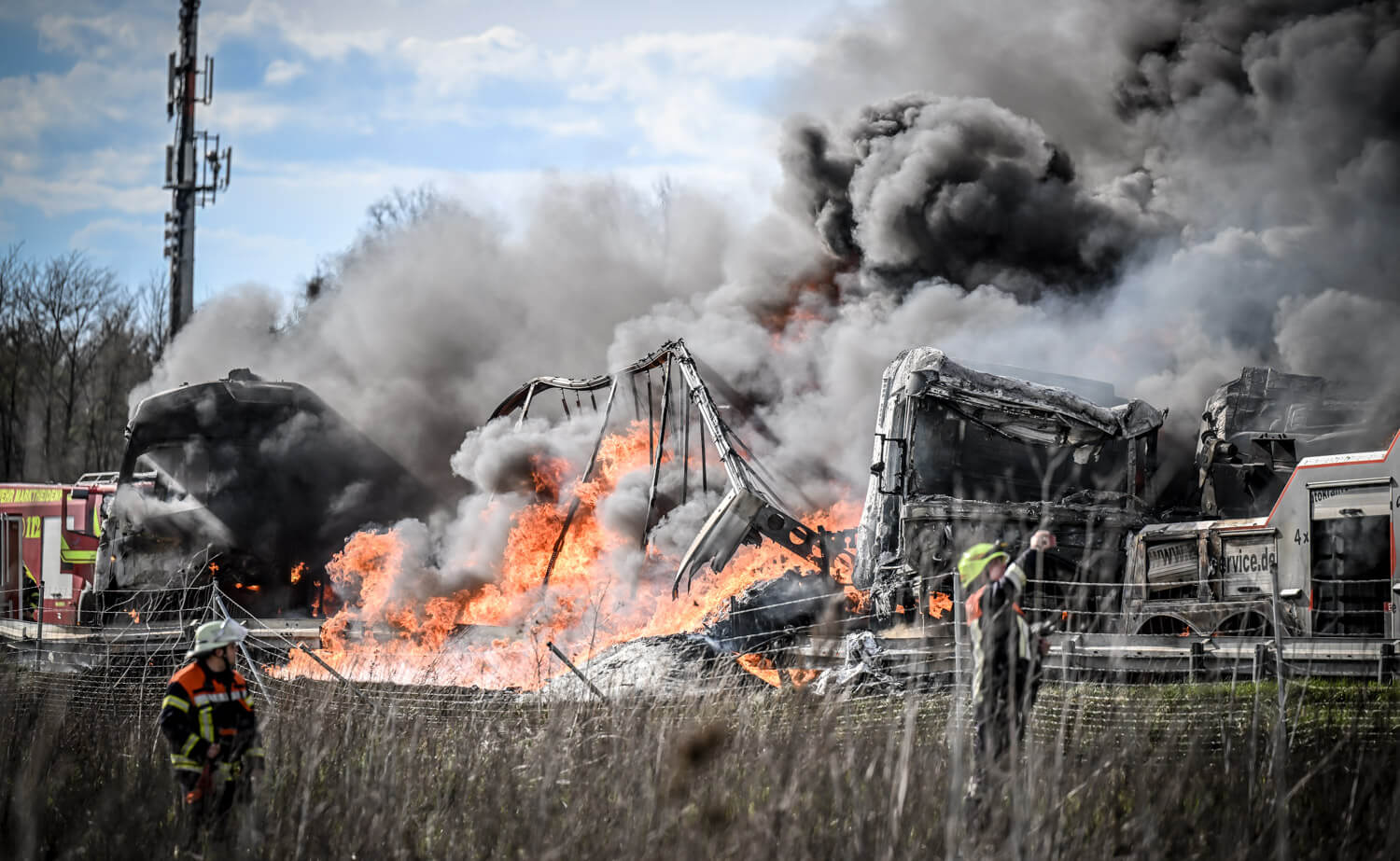 Sattelzug fährt auf Abschleppfahrzeug auf und fängt Feuer