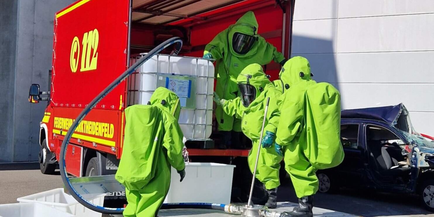 Zunächst wurden den Teilnehmenden die Ausstattung, Funktionsweise und mitgeführten Spezialgeräte des Fahrzeugs ausführlich vorgestellt. Im Anschluss folgte eine praxisnahe Einsatzübung: Angenommen wurde ein Gefahrgutaustritt, bei dem ein IBC-Behälter auf einem LKW leckschlug. Die CSA-Träger hatten die Aufgabe, den austretenden Stoff aufzunehmen und kontrolliert in ein Ersatzgebinde umzupumpen. Dabei kam auch Material des Gerätewagens Gefahrgut zum Einsatz.