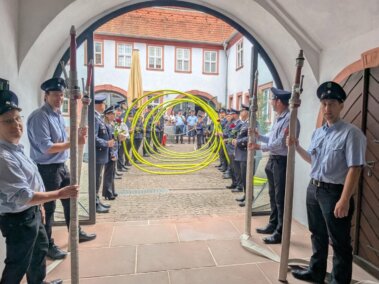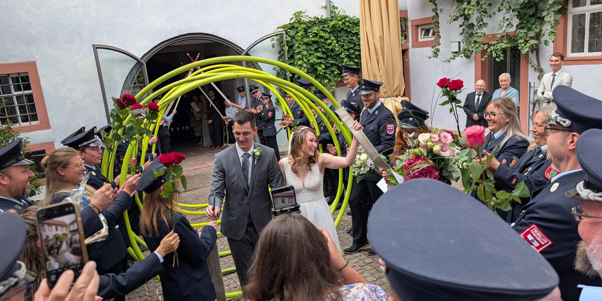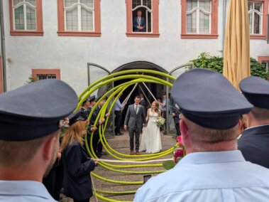 Mit uns standen – neben Arbeitskollegen, Freunden und Verwandten – die Feuerwehren Marienbrunn, Lengfurt sowie unzählige Mitglieder der Kreisbrandinspektion inklusive der Kreisjugendfeuerwehr am Franckhaus bereit, um das frisch vermählte Brautpaar im Eheleben zu begrüßen.