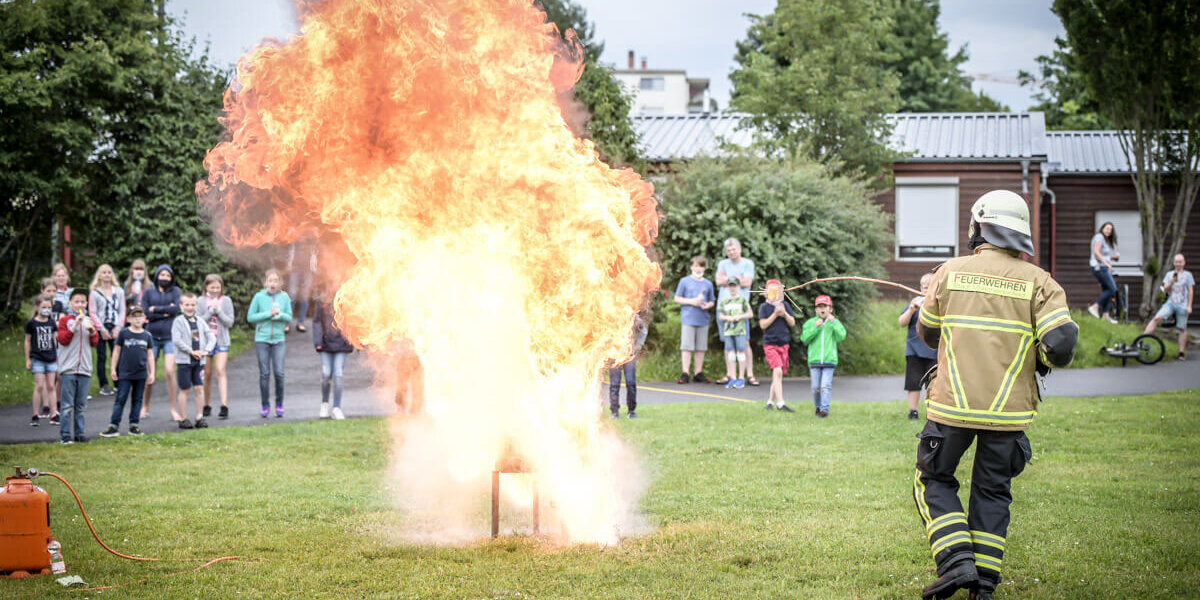 Krönender Abschluss in diesem Jahr war eine Vorführung zum Thema Fettexplosion. Gebannt konnten die Jugendlichen verfolgen, wie Kommandant Bernhard Nees eine Fettexplosion vorführte und erklärte, warum man eine brennende Pfanne auf keinen Fall mit Wasser löschen darf.